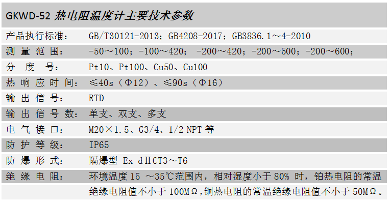 GKWD-52熱電阻溫度計(jì)是利用電阻與溫度呈一定函數(shù)關(guān)系的金屬導(dǎo)體或半導(dǎo)體材料制成的接觸式溫度儀表,可直接測(cè)量多種生產(chǎn)過程中從-200~600℃范圍內(nèi)的液體介質(zhì)、氣體介質(zhì)、蒸汽以及固體表面等的溫度,現(xiàn)已成為溫度遠(yuǎn)傳儀表的理想選擇。